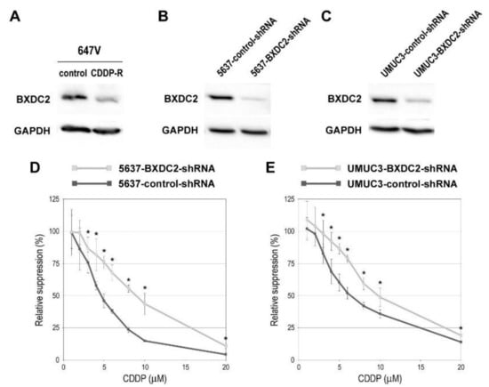 Effects of BXDC2 knockdown on cisplatin (CDDP) cytotoxicity in bladder cancer cells. Western blotting of BXDC2 in 647V-control vs. 647V-CDDP-resistant (R) sublines (A), 5637-control-shRNA vs. 5637-BXDC2-shRNA sublines (B), or UMUC3-control-shRNA vs. UMUC3-BXDC2-shRNA sublines (C). GAPDH served as a loading control. MTT assay in 5637-control-shRNA vs. 5637-BXDC2-shRNA sublines (D) or UMUC3-control-shRNA vs. UMUC3-BXDC2-shRNA sublines (E) cultured for 72 h in the presence of various concentrations (0–20 µM) of CDDP. Cell viability is presented relative to that of each subline without CDDP treatment. Each value represents the mean (± SD) from a total of 6 determinants. * p < 0.05 (vs. control-shRNA).