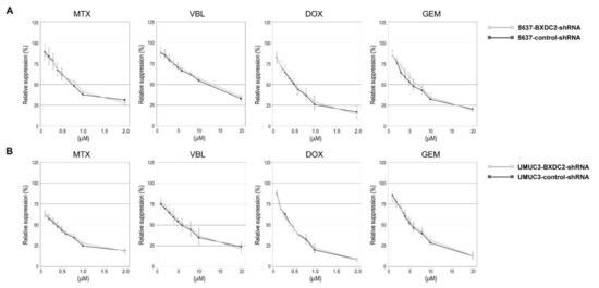 To see if BXDC2 could modulate the cytotoxic effects of other chemotherapeutic drugs used for the treatment of bladder cancer, the cell viability in the presence of various concentrations of MTX, VBL, DOX, or GEN was compared in the control-shRNA vs. BXDC2-shRNA sublines. However, there were no significant differences in sensitivity to these anti-cancer agents between the control and knockdown sublines derived from 5637 (Figure 3A) or UMUC3 (Figure 3B).