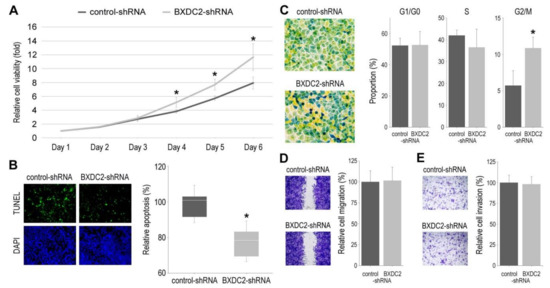 Using control-shRNA vs. BXDC2-shRNA sublines, we assessed the role of BXDC2 in the cell proliferation (via MTT assay (Figure 4A)), apoptosis (via TUNEL assay (Figure 4B)), cell cycle (Figure 4C), cell migration (via wound-healing assay (Figure 4D)), and cell invasion (via transwell invasion assay (Figure 4E)). In these assays, BXDC2-knockdown resulted in significant increases in cell viability and G2/M population, as well as a significant decrease in apoptosis. However, there were no significant differences in the G1/G0 and S phases or the ability of cell migration or invasion between the two sublines.