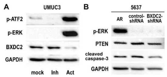 Expression of potential BXDC2 upstream and downstream proteins in bladder cancer cells. (A) Western blotting of p-ATF2, p-ERK, and BXDC2 in UMUC3 cultured with ethanol (mock), SCH 772984 (“Inh”; 4 nM for 6 h), or C6 ceramide (“Act”; 10 µM for 24 h). (B) Western blotting of p-ERK, PTEN, and cleaved caspase-3 in 5637-AR, 5637-control-shRNA, and 5637-BXDC2-shRNA sublines. GAPDH served as a loading control.