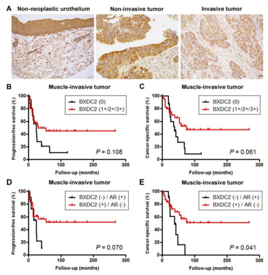 Immunohistochemistry of BXDC2 in surgical specimens. (A) Expression of BXDC2 in non-neoplastic urothelium (original magnification: ×200), non-invasive urothelial tumor (original magnification: ×400), and invasive urothelial tumor (original magnification: ×200). Immunoreactivity is seen mainly in the cytoplasm of urothelial cells. Kaplan–Meier analysis for progression-free survival (B) or cancer-specific survival (C) in patients with BXDC2-negative (n = 16) vs. BXDC2-positive (n = 35) muscle-invasive tumor. Kaplan–Meier analysis for progression-free survival (D) or cancer-specific survival (E) in patients with BXDC2-negative/AR-positive (n = 9) vs. BXDC2-positive/AR-negative (n = 30) muscle-invasive tumor.
