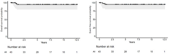 Two of the 47 patients (4%) relapsed. Both developed lung recurrence, one of them (who had lung and liver metastasis at diagnosis) combined with concurrent abdominal relapse. Both patients eventually died from disease within the first 2 years post-diagnosis. Both patients had received abdominal radiotherapy during first-line treatment, combined with lung irradiation in one of them. No relapse occurred in patients treated without radiotherapy (Figure S3). Of the 47 patients, 18 achieved complete remission with chemotherapy alone at week six; only one of them received radiotherapy to the metastatic site. Among the 29 patients who did not attain complete remission at week six, 13 switched to the high-risk CDCV postoperative chemotherapy regimen. One of these patients relapsed. Details on relapse patterns are depicted in Table 2. The 5year EFS and OS were 95% (95% CI 88–100) and 95% (95% CI 88–100), respectively (Figure 1).