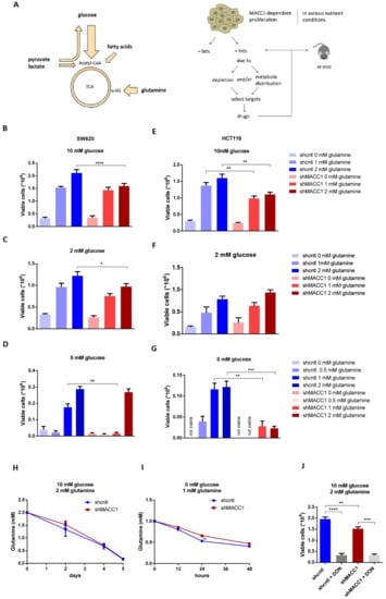 Glutamine is the second most important nutrient after glucose used by cells to generate precursors necessary for cell growth and survival. Here we analyzed the relevance of glutamine for MACC1-dependent cell proliferation. A high glucose (10 mM), low glucose (2 mM) and no glucose (0 mM) environment combined with various glutamine concentrations was applied to SW620 shcntl, SW620 shMACC1 as well as to HCT116 shcntl and HCT116 shMACC1 cells. MACC1 had no effect on cell proliferation in these SW620 and HCT116 cells if glucose is abundant and glutamine is depleted (