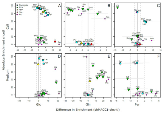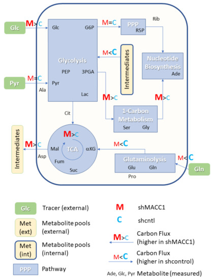 Overall, we could show that MACC1 knockdown leads to differential metabolite labeling in various parts of the central metabolism, probably due to the differential use of glycolysis and glutaminolysis, which can be expected to contribute to the observed growth differences.
