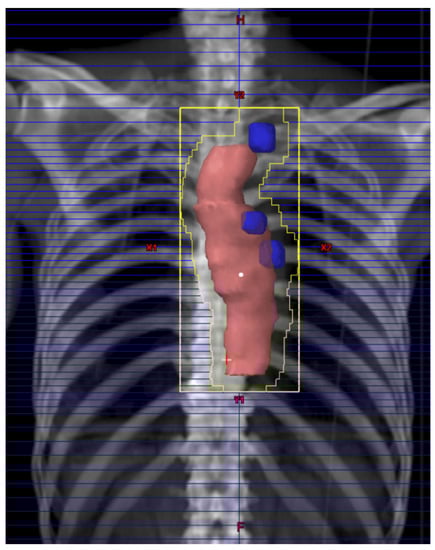 The regimen for NACRT was concurrent treatment with CF plus radiation. The drug dosages used for CF were identical to those used in the JCOG 9204 [6], JCOG 9907 [7], and JCOG 1109 trials [8]. Briefly, 80 mg/m2 cisplatin were administrated on day 1, and 800 mg/m2 5-fluorouracil were administered as a continuous infusion from day1 to day 5. This protocol was then repeated with a 3- to 5-week interval in between. A representative radiation field in a patient with middle thoracic ESCC is shown in Figure 1. External body radiation was delivered with anterior and posterior opposite-beam interpolation using a 10 MV X-ray beam at 1.8–2.0 Gy/day for 5 days each week for a total dose of 41.4 Gy in 23 fractions. Radiation fields were limited to the primary esophageal lesion, with a 3-cm craniocaudal margin, and to clinically metastatic LNs; there was no elective nodal area radiation. If supraclavicular LNs were clinically negative, these LNs were outside of radiation field. All radiation plans were developed by certificated radiation oncologists using three-dimensional conformal radiotherapy planning based on simulation CT. Grading of adverse events with NACRT was according to the Common Terminology Criteria for Adverse Events (CTCAE) Version 5.0 (https://ctep.cancer.gov/protocolDevelopment/electronic_applications/ctc.htm#ctc_50, accessed on 8 January 2021).