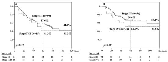 Kaplan–Meier analyses of OS and DSS among clinical Stage III and IVB patients are shown in Figure 2. The five-year OS rates among clinical Stage III and IVB patients were 57.6% and 41.3%, respectively (Figure 2A). There was no significant difference in five-year OS between clinical Stage III and IVB patients. The five-year DSS rates among clinical Stage III and IVB patients were 66.4% and 51.6%, respectively (Figure 2B). Similarly, there was no significant difference in five-year DSS between clinical Stage III and IVB patients.