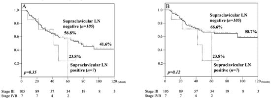 Kaplan–Meier analysis of OS and DSS among pathologically supraclavicular LN metastasis-negative and -positive patients are shown in Figure 3. Although all of these patients were diagnosed as clinical Stage III or more before treatment, the five-year OS rates of pathologically supraclavicular LN metastasis-negative and -positive patients were 56.8% and 23.8%, respectively (Figure 3A). However, the number of patients was small, and no significant difference in five-year OS between the two groups was detected. The five-year DSS rates among pathologically supraclavicular LN metastasis-negative and -positive patients were 66.6% and 23.8%, respectively (Figure 3B). Similarly, no significant difference in five-year DSS was detected between the two groups.