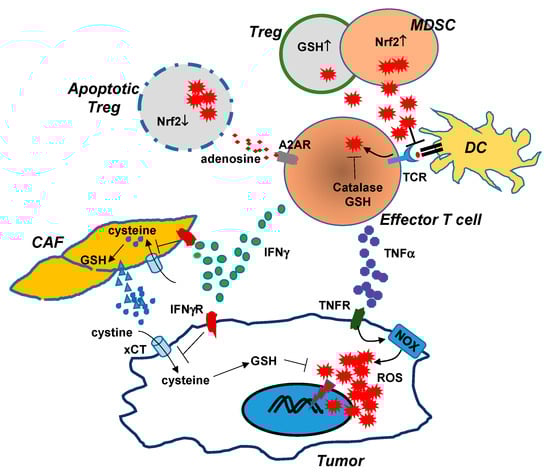Interactions between cells in the TME lead to changes in redox status. Tumor-reactive effector T cells (CD4+ and CD8+) can induce increased levels of ROS in cancer cells via the actions of IFNγ and TNFα. TNFα signaling in tumor cells activates NADPH oxidases, which lead to increased production of ROS. IFNγ signaling in tumor cells diminishes xCT expression through transcriptional inhibition, reducing tumor uptake of extracellular cystine and subsequent GSH synthesis. IFNγ signaling in cancer-associated fibroblasts (CAF) blocks the release of GSH and cysteine, further depleting the extracellular pool of cystine and cysteine available to cancer cells. The severe redox imbalance in cancer cells, caused by TNFα-driven ROS production and IFNγ-induced GSH deficiency, leads to extensive oxidative damages and eventual tumor cell death. However, effector T cells are also susceptible to oxidative stress in the TME. ROS induced upon TCR engagement are counterbalanced by increased antioxidant systems such as GSH and catalase. T cell dysfunction may occur when effector T cells are exposed to ROS produced by MDSCs and Tregs, which are more resistant to oxidative stress due to their increased antioxidant systems. High levels of extracellular ROS can disrupt antigen-presentation between T cells and DCs, and can affect tumor antigen recognition by T cells. Some apoptosis-prone Tregs can increase the presence of adenosine in the TME, which suppresses the function of effector T cells in an A2AR-dependent manner. Therapeutic interventions should be directed to enhance T cell-induced tumor oxidative stress while enabling T cells to resist the elevated oxidative stress in the TME.