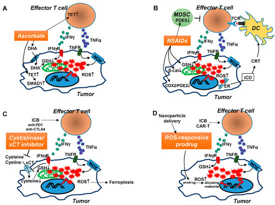 Hypothetical mechanisms by which certain pro-oxidants enhance the efficacy of cancer immunotherapies. Tumor-reactive effector T cells, emerging in the TME after either ICB therapy or adoptive transfer, can mediate tumor killing via well-characterized mechanisms involving cytolytic granules such as perforin and granzymes, and apoptosis-inducing ligands such as FASL and TRAIL. Increasing evidence reveals that inflammatory cytokines produced by effector T cells, including TNFα and IFNγ, can exert antitumor effect by modulating tumor redox. TNFα signaling in cancer cells activates NOX-dependent ROS production, while IFNγ signaling exacerbates GSH deficiency by suppressing the cysteine/glutamate transporter xCT. The combined effects of TNFα and IFNγ lead to substantial ROS accumulation in tumor cells, rendering them vulnerable to further redox disruption which can be incited by a pro-oxidant. A suitable pro-oxidant should preferentially induce oxidative stress in cancer cells without harming antitumor T cells. The potential mechanisms of action of four immunotherapy-compatible pro-oxidants are illustrated. (A). Pharmacological dose of ascorbate, in its oxidized form DHA, can be preferentially taken into cancer cells via the glucose transporter (GLUT1). Intracellular DHA is reduced to ascorbate at the expense of GSH. The GSH shortage aggravates ROS accumulation, which damages DNA/protein/lipid and derails cell metabolism, leading to tumor cell death. Meanwhile, ascorbate may induce TET activities in antitumor T cells and tumor cells. TET activation in T cells leads to enhanced function of T cells through epigenetic modifications. TET activation in tumor cells results in demethylation and activation of SMAD1, which increases tumor chemosensitivity. (B). NSAIDs can act as pro-oxidants to reduce GSH and thereby increase the levels of ROS in tumor cells. NSAID-induced ER stress may lead to release of calreticulin (CRT), a DAMP molecule characteristic of ICD, which can attract and activate DCs, which in turn elicit antitumor CD8+ T cell responses. In addition, NSAIDs can suppress tumor cell growth by its inhibitory effect on β-catenin, COX2, and PGE2. Some NSAIDs may reduce MDSC activity by inhibiting PDE5 function in MDSCs. (C). Cyst(e)inase or xCT inhibitors can reduce the presence or block the uptake of extracellular cystine and cysteine, which tumor cells rely on to synthesize GSH, respectively. Cyst(e)inase can act in concert with ICB-induced antitumor T cells to drive tumor cell ferroptosis. (D). ROS-responsive prodrugs can be effectively delivered to tumor loci by nanoparticles. The increased levels of ROS in the TME can activate these prodrugs, which give rise to alkylating metabolites to cause further DNA damage and intensify oxidative stress in tumor cells. These prodrugs may synergize with antitumor T cells because ROS accumulated in tumor cells after immunotherapies such as ICB or CAR-T therapy can effectively activate prodrugs, which in turn further amplify ROS in tumor cells to drive apoptosis.