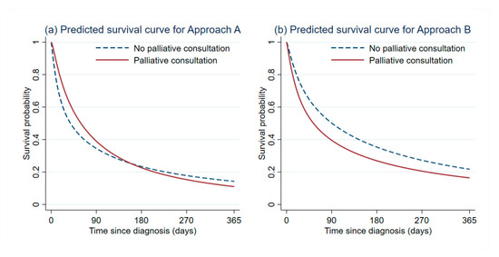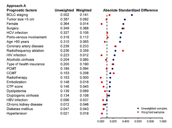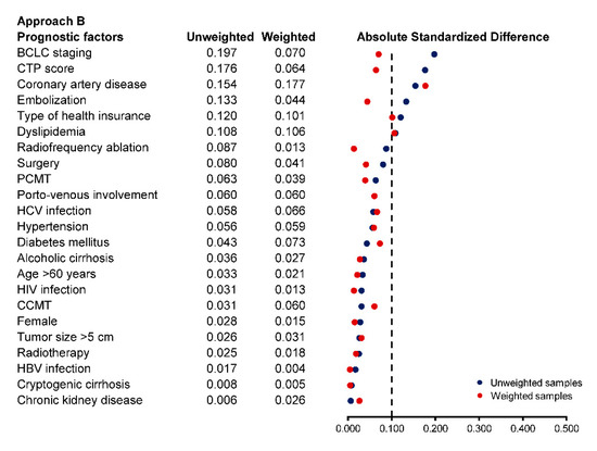 For approach A, we used inverse probability treatment weighting (IPTW), which is a type of propensity score method [30,31], to account for potential selection bias, confounding by indication, and confounding by contraindication [31]. Multivariable logistic regression modeling was used to predict the probability of being and not being in a palliative care consultation group for each specific patient. The following features were included in the logistic model: gender, age, type of health insurance, comorbidity, tumor etiology, BCLC staging, CTP score, tumor size, porto-venous involvement, and HCC specific treatment received. Other clinically relevant parameters at HCC diagnosis, such as serum albumin, serum bilirubin, prothrombin time, the presence of ascites, or hepatic encephalopathy, were not included in the model to avoid clinical and statistical collinearity with the CTP score [32]. These probabilities were then used for creating inverse probability weights to construct a weighted cohort of patients with similar baseline characteristics.
