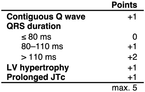 Twelve-lead electrocardiograms (ECGs) were recorded using GE Healthcare ECG machines (GE, Milwaukee, WI, USA). Assessment of the ECG score was done in accordance with the original publication in which the score was developed (Figure 1) [15]. In brief, all ECGs were evaluated concerning the following parameters: contiguous Q wave, QRS duration, marker of LV hypertrophy and prolongation of the JTc interval. Contiguous Q waves were defined as a Q wave duration > 40 ms and/or a Q:R ratio amplitude > 25% in any two contiguous leads [16]. The presence of a contiguous Q wave counted as 1 point. The QRS duration was measured in a standard manner in lead II. A QRS duration of <80 ms was yielded for 0 points, 80–110 ms for 1 point and >110 ms for 2 points. The LV hypertrophy was assessed by the Sokolow−Lyon Index being positive (+1 point) if the sum of S in V1 and R in V5 or V6 was ≥3.5 mV [17]. The JTc time was calculated by QTc minus the QRS duration with QT being measured as the maximum value in leads II, V5 or V6 and QTc being calculated with Bazzett’s formula [11]. A JTc prolongation > 360 ms accounted for 1 point. After assessment of all 4 parameters, the ECG score was calculated by summation (Figure 1) [19].