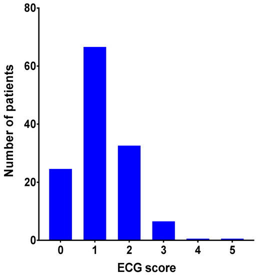 The ECG score was calculated in all 134 patients [19] and 25 patients achieved 0 points, 67 patients achieved 1 point, 33 patients achieved 2 points, seven patients achieved 4 points and one achieved 4 or 5 points respectively (Figure 2).