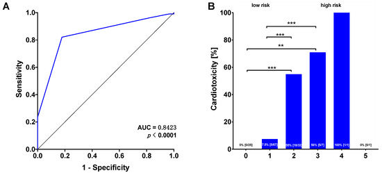 (A) Predictive value of the ECG score for cardiotoxicity determined using the ROC analysis. (B) Incidences of cardiotoxicity increase with increasing score values. ** p < 0.01, *** p < 0.001.