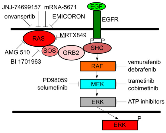 Dysregulation of the MAPK pathway plays a central role in a number of malignancies and therapeutic inhibition of oncogenic RAS is of great clinical importance. There has been a significant progress made in this area resulting in successful targeting of KRAS or downstream effectors in several cancer types, with multiple agents in clinical trials (Table 1). The trials listed in Table 1 are only a handful of selected studies chosen to be highlighted in this review. It is important to note that over 200 results exist when searching for clinical trials related to KRAS on Clinicaltrials.gov (accessed on 24 February 2021). A good number of these trials are recruiting and active as well are testing combinations between chemotherapeutics and other drugs that have been shown to attenuate KRAS mutant phenotypes in vitro. However, our understanding how KRAS inhibitory ligands selectively target protein conformation and how they interfere with the MAPK pathway is most likely still incomplete. In addition, we need to fully understand why acquired KRAS mutations are more prominent in certain cancer types. For example, KRAS mutations in lung cancer may be more frequent due to exposure to carcinogens, such as tobacco smoke. Overall, the close interaction between preclinical experimental approaches and theoretical approaches, including molecular dynamic simulation, will continue to play a key role in the treatment and the ultimate eradication of KRAS mutant tumors.