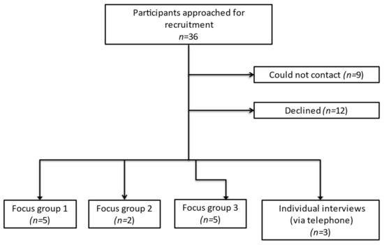 Of 36 eligible patients invited to the study, 15 agreed to take part (Figure 1). Reasons for declining the study included time or logistical constraints, burden of hospital appointments and feeling too unwell. Focus groups each took two hours whilst interviews ranged from 29 to 60 min.