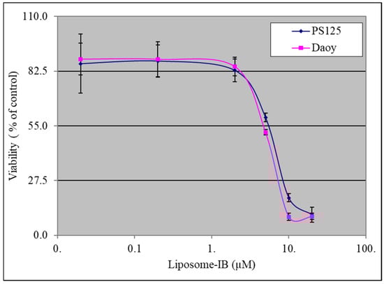 Given the relatively higher level of NOX4 expression in SHH MB compared to the other MB subgroups, we chose to focus on Shh-activated MB cells for testing Lipo-IB due to the potential clinical implications. To test whether Lipo-IB has an effect on Shh-activated MB cell viability, we performed a 3-(4,5-dimethylthiazol-2-yl)-2,5-diphenyl-2H-tetrazolium bromide (MTT) assay 40 h after Lipo-IB treatment of murine PS125 and human Daoy SHH MB cells. We have observed that liposomes alone have no effect on MB cells in keeping with our prior investigations using tumor cells [,,]. Results show that Lipo-IB significantly inhibited SHH MB cell viability in a dose-dependent manner, with a 50% inhibitory concentration (IC50) of approximately 5.9 uM for PS125 and 5.1 uM for Daoy cells (Figure 1). This is in keeping with the IC50 range reported for non-liposomal IB (0.16–7.7 uM) against a variety of cancers [,,].