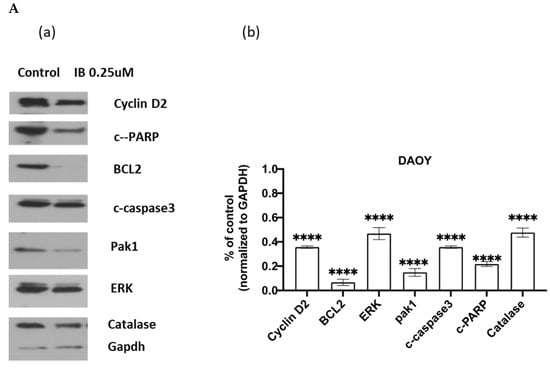 Daoy was cultured in DMEM medium containing 10% serum for 24 h, then added imipramine blue 0.25 µM for 48 h. Whole cell lysates were harvested in lysis buffer (Cell Signaling Technology, Danvers, MA) for Western Blot. Western blot was performed with the following primary antibodies: PAK1, Catalase, ERK1/2, Cyclin D2 and Gapdh (Cell Signaling Technology, Danvers, MA); BCL2, Cleaved -PARP and Caspase-3(ABCAM, Cambridge, MA, USA). Goat anti-rabbit antibodies (Santa Cruz, Dallas, TX, USA) were used and the immunoreactive bands were detected by ECL. Original images can be found at Figure S1.