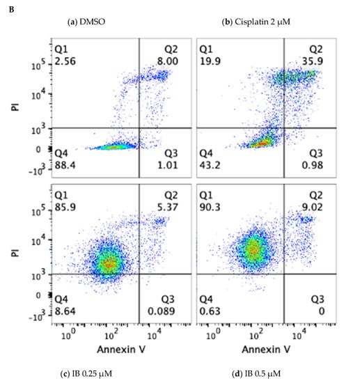 Erk and PAK activation are cardinal features of medulloblastoma aggressiveness and are required for cell migration and invasive behavior []. Treatment with nanomolar quantities of IB led to decreased ERK expression, PAK expression, and decreased expression of catalase (Figure 2a). The downregulation of catalase is a biomarker of Nox inhibition, as Nox generated hydrogen peroxide activates catalase. IB kills medulloblastoma cells at 72 h of exposure. Surprisingly, IB treatment did not upregulate PARP cleavage, suggesting that necrosis, rather than apoptosis is the major mode of cell death. We further confirmed that IB causes necrosis through flow cytometric analysis (Figure 2b).