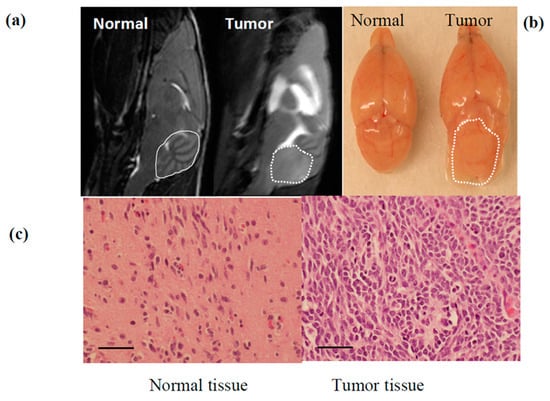 Pilot experiment to confirm MB in SmoA1 mouse is identified by MRI. (a) MRI scan of 12 week old SmoA1 mice demonstrating a normal brain (entire cerebellum circled in solid line) compared to mouse with MB in cerebellum (tumor circled in dash line) allowing for tumor volumes measurement prior to treatment (b) Dissected brain tissue showing the gross presence of MB tumor in the cerebellum (circled). (c) Histological evaluation by H&E straining confirming cellular architecture and confluence of sheets of small round blue tumor cells. Scale bar: 50 µM.