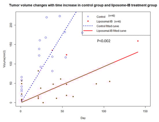 Tumor volume comparison between control and Lipo-IB treated mice for all the mice tested. Blue hollow circles (O) represent mice from control group and the red solid circles represent mice from the treatment group.