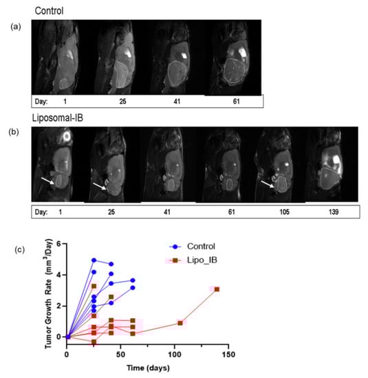 No gross toxicities (e.g., weight loss, diminished activity, general appearance) were observed in Lipo-IB treated mice. All the mice (treated or control) were monitored by serial MRI (T2 weighted image) to noninvasively measure change in tumor volume over time (every 2–3 weeks) in response to the Lipo-IB therapy. Tumor size increased dramatically in control group compared with the treatment group (Figure 4 and Figure 5). Images from one representative mouse from the treatment and control groups each is shown (Figure 5a,b). This mouse in the Lipo-IB treatment group, displayed complete abrogation of the tumor; however, the tumor recurred after the treatment ended one month later (Figure 5b, white arrows). The treatment efficacy in vivo was established by determining the tumor growth rate (GR), which is the relative change in tumor volume per unit time (one day was used as the minimal unit of time). We plotted the individual growth curves of all tumors, and this demonstrated significant slowing of tumor growth as a result of treatment. There were no significant differences in tumor size at the start of the experiment (Figure 5c).