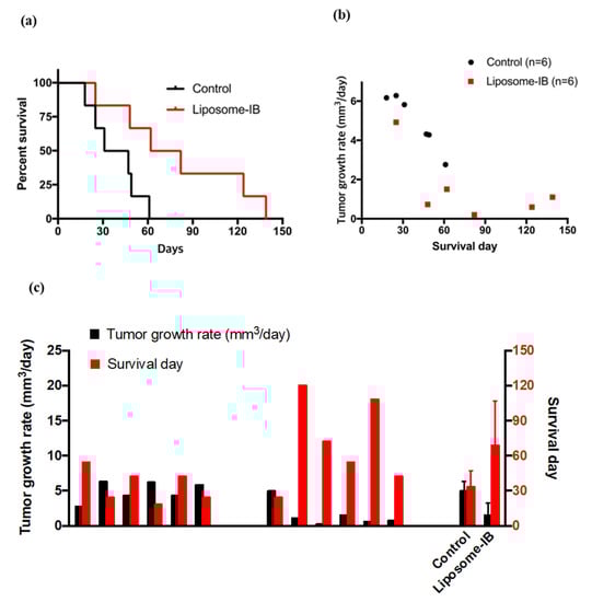 The Pearson correlation analysis demonstrated a significant negative correlation between the mouse survival time and the tumor specific growth rate. The Pearson correlation coefficient was −0.78 (p < 0.002). The relationship is shown in Figure 6b for both control and Lipo-IB treatment mice. These results indicate that longer survival time in the treatment mice was accompanied by smaller tumor specific growth rate and shorter survival time in the control mice went along with larger tumor specific growth rate. This analysis was plotted for each individual mouse in Figure 6c.