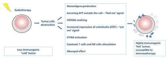 In summary, radiotherapy destabilizes the function of cancer cells, contributes to the release of tumor antigens and the formation of neoantigens, and affects the production of cytokines, chemokines and other substances that stimulate the activity of immune cells. As a result, low-immunogenic (“cold”) tumors are transformed into highly immunogenic (“hot”, “inflammatory”) tumors, abundant in activated cells of specific immune response (Figure 1) [,,]. Thanks to this, the mechanism of escape of cancer cells from immune surveillance is overcome. Tumor cells are more sensitive to the action of immunotherapy targeted immune checkpoints. The use of anti-PD-1 or anti-PD-L1 antibodies after radiation therapy may contribute to increasing the effectiveness of immunotherapy in patients with non-small cell lung cancer and to prolonging overall survival (OS) and progression free survival (PFS) [].