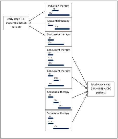 Currently, numerous phase 1. and 2. clinical trials are underway, in which various chemioradiotherapy regimens and radiotherapy methods (usually stereotactic radiotherapy) are used in combination with anti-PD-1 (nivolumab, pembrolizumab) or anti-PD-L1 (atezolizumab, durvalumab, avelumab) antibodies in early stage NSCLC patients (especially if surgery is not available) or locally advanced NSCLC patients []. In these studies, radiotherapy or chemoradiotherapy in relation to immunotherapy is used in a sequential, concurrent and inductive manner [].