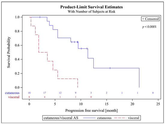 Progression free survival probability of patients with superficial (cutaneous) and visceral AS.