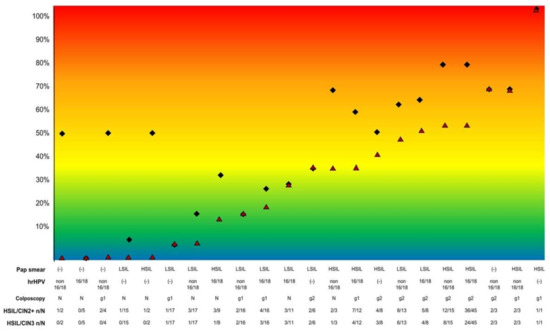 - Silver, M.I.; Andrews, J.; Cooper, C.K.; Gage, J.C.; Gold, M.A.; Khan, M.J.; Massad, L.S.; Parvu, V.; Perkins, R.B.; Schiffman, M.; et al. Risk of Cervical Intraepithelial Neoplasia 2 or Worse by Cytology, Human Papillomavirus 16/18, and Colposcopy Impression. Obstet. Gynecol. 2018, 132, 725–735. [Google Scholar] [CrossRef]