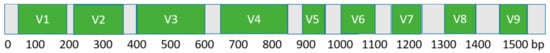 The most widespread technique used to identify the bacterial composition in a specimen is targeted 16S rRNA amplicon sequencing. The 16S rRNA gene is composed of conserved, unchanged domains, present in all bacterial species and nine different hypervariable regions V1 to V9 (Figure 1). Hypervariable regions are a blueprint for every bacteria and are widely used in the identification, classification and phylogenetic analysis of various bacteria. To detect specific species, sets of primers are designed based on the sequence information of the variable regions. The accuracy of this method strongly depends on the choice of primer pairs and, in particular, on the balance between efficiency, specificity and sensitivity in the amplification of the different V1–V9 bacterial 16S sequences contained in a sample [24].