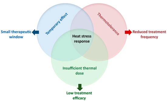 Clinical successes have been achieved by utilizing mild HT as a chemo or radiosensitizing agent [2,3,4], but the efficacy of these treatments is nevertheless limited by a number of factors, irrespective of the treated tumor subtype. Firstly, to efficiently sensitize a tumor to chemo or radiotherapy, an adequate thermal dose must be delivered to the entire tumor volume while minimizing the temperature increase in the surrounding noncancerous tissues [21]. Higher tumor temperatures are associated with better clinical outcomes [22,23]. Due to both technical and biological reasons, however, achieving these goals remains challenging. For example, well vascularized subvolumes within the tumor can result in local “cool spots”, and excessive temperatures (“hot spots”) can occur in poorly vascularized normal tissue regions outside the tumor or at the interface between different tissue types. These hot spots must be suppressed as they cause discomfort and, potentially, toxicity to the patient, and clinicians are often forced to decrease the power delivered to the tumor to the extent that the desired target temperature or thermal dose cannot be achieved [24]. Secondly, most sensitizing effects of mild HT are of a temporary nature, resulting in a relatively short time window during which the tumor is optimally sensitized to the coadministered treatment modalities. This is illustrated, for example, by the finding that a long time-interval between HT and radiotherapy negatively affects the overall survival of women with locally advanced cervical cancer [25], but a debate is ongoing to what extent these findings are patient and treatment dependent [26,27,28]. Thirdly, heat stress triggers a protective cellular response, known as the heat stress response, which counteracts the effects of HT and temporarily renders cells less sensitive or even insensitive (i.e., thermotolerant) to a subsequent treatment, thereby reducing its chemo and radiosensitizing effects [29,30]. Consequently, there is a practical limit on the frequency at which HT can be applied, such that HT sessions are scheduled at intervals of at least three days. Finally, the ability of HT-based therapies to sensitize metastases, in addition to the primary tumor, is currently restricted to the local metastases that are targeted in regional HT. In conclusion, there are important limitations to the efficacy of clinical mild HT-based therapies and overcoming these limitations could improve their clinical performance and patient outcomes.