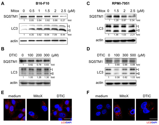 Since autophagy has been demonstrated to play a critical role in cancer progression and therapeutic response to chemotherapy [15], we examined whether MitoX, an anthracycline that is clinically used to treat several types of cancer, could increase the autophagic flux in melanoma cells. As shown in Figure 1, we observed gradual light chain 3 (LC3)-II accumulation and SQSTM1 degradation in B16-F10 cells 24 h after increasing the MitoX dose (Figure 1A). However, exposure to DTIC, the most common clinically used single chemotherapeutic agent for melanoma [16], did not interfere with autophagic activity (Figure 1B). We also observed similarly increased autophagic flux on MitoX treatment and no change in autophagic activity on DTIC treatment in RPMI-7951 human melanoma cells (Figure 1C,D). Accordingly, confocal microscopy analysis showed that MitoX treatment, but not DTIC stimulation, resulted in LC3 aggregation in both B16-F10 and RPMI-7951 cells (Figure 1E,F). These findings indicated an increase in autophagic influx in response to MitoX, but not DTIC, in vitro.