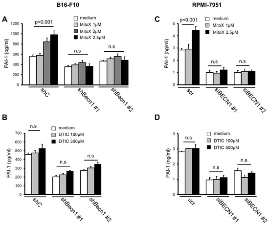 Mitoxantrone (MitoX) promotes plasminogen activator inhibitor (PAI)-1 secretion through autophagy. (A) Scramble (shC) or Becn1-silenced (shBecn1#1 and shBecn1#2) B16-F10 cells were treated with MitoX (1, 2, or 2.5 μM) for 24 h. Soluble PAI-1 levels in supernatants from the cells were determined by enzyme-linked immunosorbent assay (ELISA). (B) ELISA of PAI-1 concentration in CM from shC, shBecn1#1, and shBecn1#2 cells treated with dacarbazine (DTIC) was performed. (C) Scramble (scr)- or siBECN1-expressing (siBECN1#1 and siBECN1#2) RPMI-7951 cells were stimulated with MitoX (C) or DTIC (D) at the indicated doses for 24 h. Secreted PAI-1 amounts were analyzed by ELISA. p values were determined by two-tailed Student’s t test; n.s, not significant.