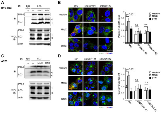 MitoX- or DTIC-treated cells, along with control cells, were harvested for 24 h. After washing with PBS, cell proteins were extracted by incubation with the lysis buffer. Immunoprecipitation assays were performed by adding protein A agarose bead (Merck Millipore, Burlington, MA, USA) to the cell lysates and incubating them overnight with specific antibody against LC3 (MBL) at 4 °C. The immune-complexes were separated by SDS-PAGE and detected by immunoblotting using anti-LC3 (Abcam) and anti-PAI-1 (Novus Biologicals, Littleton, CO, USA) antibodies.