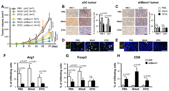 Chemoresistance of melanoma cells to mitoxantrone (MitoX) in vivo correlates with the pro-tumoral microenvironment. (A) C57BL/6 mice were subcutaneously inoculated with scramble-expressed (shC) or shBecn1#1 (shBecn1) B16-F10 cells. Phosphate-buffered saline (PBS), MitoX, or dacarbazine (DTIC) was intratumorally administered every day 7 days post-inoculation. Tumor volume was monitored at the indicated days. N denotes the number of mice per group. (B,C) Representative immunohistochemical images of plasminogen activator inhibitor-1 and light chain 3 staining in shC (B) or shBecn1 (C) tumor tissues, as described in (A), are shown. Positive-stained cells in shC and shBecn1 tumors were analyzed by defining regions followed by quantification using Phenochart and inForm® software. Scale bar, 50 μm. (D,E) Multiplex immunofluorescent staining of shC (D) or shBecn1 (E) tumor sections was performed using anti-Arg1 (yellow), anti-Foxp3 (green), and anti-CD8α (red) antibodies, and counterstaining was performed using DAPI (blue). Scale bar, 50 μm. (F–H) Quantification of infiltrating Arg1+, Foxp3+, and CD8α+ cells in tumor regions was performed. Results were presented as the mean cell numbers of positive staining cells in five selected regions in each slide. p values were determined by two-tailed Student’s t test; n.s, not significant.