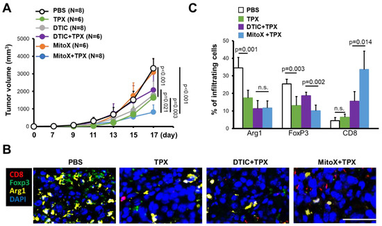 Pharmacological inhibition of plasminogen activator inhibitor (PAI)-1 overcomes chemoresistance to mitoxantrone (MitoX) and correlates with the anti-tumor microenvironment. (A) C57BL/6 mice were subcutaneously injected with scramble-expressed B16-F10 cells and then intratumorally administered with phosphate-buffered saline (PBS), MitoX, or dacarbazine (DTIC) daily or oral gavage administration of tiplaxtinin (TPX) every 2 days beginning at 7 days after inoculation. Tumor volume was measured at the indicated days. N denotes the number of mice per group. (B) Representative images of multiplex immunofluorescent staining in tumors subjected to PBS, TPX, DTIC and TPX or MitoX and TPX combination therapy were obtained. Arg1+ (yellow), Foxp3+ (green), and CD8α+ (red) cells were identified. Scale bar, 50 μm. (C) Quantification of staining positivity of cells in tumors, as described in (B), was shown. p values were determined by two-tailed Student’s t test. n.s, not significant.