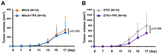 We then tested whether PAI-1 blocking in autophagy-proficient tumors could overcome chemoresistance to MitoX. Compared with that in the PBS-treated control group, therapeutic efficacy was observed in mice with shC-derived tumors treated with TPX, a specific inhibitor for blocking PAI-1 bioactivity [17] (p < 0.001, Figure 5A). Notably, shC tumor-bearing mice treated with MitoX in conjunction with TPX, compared with mice subjected to TPX or MitoX monotherapy, showed dramatic tumor growth inhibition (p = 0.003 for MitoX + TPX v.s. TPX; p < 0.001 for MitoX + TPX v.s. MitoX; Figure 5A). In contrast, DTIC and TPX combination therapy, compared with TPX or DTIC monotherapy, did not exert increased therapeutic benefits in tumor-bearing mice (p = 0.208 for DTIC + TPX v.s. TPX; p = 0.252 for DTIC + TPX v.s. DTIC, Figure 5A). These results suggest that PAI-1 plays a critical role in MitoX-elicited chemoresistance in melanoma. Strikingly, MitoX and TPX combination therapy exerted more effective tumor suppression in mice than DTIC and TPX combination therapy (p = 0.021, Figure 5A). Multiplex IHC images showed that mice receiving TPX therapy displayed reduced tumor-infiltrating Arg1+ M2 macrophages and Foxp3+ Treg cells, whereas the frequency of CD8+ cytotoxic T lymphocytes was not changed (Figure 5B,C). Additionally, pro-tumoral Treg cell infiltration was reduced, whereas CD8+ T cell infiltration was increased on MitoX and TPX combination treatment, compared with on DTIC and TPX combination treatment (Figure 5B,C). Of note, similar tumor growth inhibition was observed between shBecn1#1-derived tumor-bearing mice subjected to MitoX and TPX combination therapy and those subjected to MitoX monotherapy (p = 0.283, Figure 6A). However, shBecn1#1 tumor-bearing mice administered with DTIC and TPX, compared with those administered with only DTIC, displayed moderately reduced tumor growth, but this difference was not statistically significant (p = 0.096, Figure 6B). These results suggest that tumor autophagy-mediated PAI-1 secretion contributes to resistance to MitoX-based chemotherapy in melanoma.