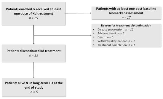 A total of 25 patients were enrolled between 14 December 2017 and 29 May 2019. All patients received at least one dose of Kd. A total of 17 patients had at least one biomarker assessment post-baseline evaluation (Figure 1).