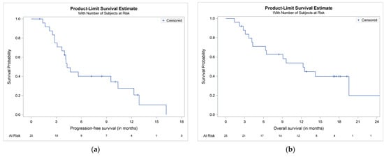Kaplan–Meier plots of (a) progression-free survival (PFS) and (b) overall survival (OS) of the 25 patients included in the CarMMa study.