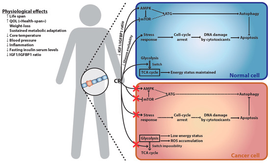Cellular and physiological effects of ER. Consequences of ER at the physiological level (left) and its differential impact on normal versus cancer cells (right). ER has broad-ranging physiological effects, increasing both lifespan and QOL. This increase in the length and quality of life is strongly associated with ER-induced weight loss and sustained metabolic adaptation. The latter results in decreased markers of accelerated senescence, including core-body temperature, blood pressure, inflammation, fasting insulin serum levels, and IGF1/IGFBP1 ratio. This last parameter explains part of ER-mediated differential effect on cancer versus healthy cells: decreased IGF1/IGFBP1 ratio up-regulates AMPK, an activator of autophagy, and down-regulates mTOR, an autophagy inhibitor. Autophagy then protects the normal cell against chemotherapy-induced cell death. This cellular switch is not observed in cancer cells, which often have developed independence from the IGF1/IGFBP1 signal. Furthermore, ER reduces circulating glucose levels, which induces a cell-cycle arrest, thus protecting cells against chemotherapy-induced DNA damage. Cancer cells are often independent of cell-cycle arrest signals, and thus suffer increased DNA damages upon chemotherapeutic treatment. Finally, reduced glucose availability induces a reliance of normal cells on the TCA cycle for maintaining their energy status. This is not possible in most cancer cells, which rely on glycolysis to fuel their growth (“Warburg effect”) and are thus deprived of energy. As increased oxygen consumption fails to produce ATP, this leads to the accumulation of toxic ROS in cancer cells, an effect which has been referred to as the “anti-Warburg effect”. AMPK, AMP-activated protein kinase; ATG, autophagy-related proteins; ER, energy restriction; IGF, insulin-like growth factor; IGFBP, IGF-binding protein; mTOR, mammalian target of rapamycin; QOL, quality of life; ROS, reactive oxygen species; TCA, tricarboxylic acid.