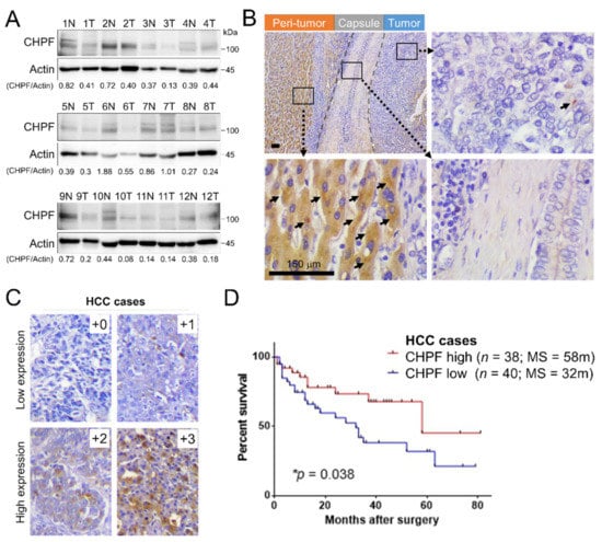 CHPF expression in human hepatocellular carcinoma (HCC). (A) CHPF levels and quantification in non-tumor (peri-tumor) liver (N) and tumor tissue (T) of primary HCC tissues from twelve patients. (B) Immunohistochemistry of CHPF in a representative HCC tissue. Dot-like precipitations of CHPF (arrow) were observed mainly in peri-tumor tissues but rarely in stromal and tumor tissues. The scale bar indicates 50 μm. (C) Representative images of four grades of CHPF expression in primary HCC tissue (+0, negative; +1, <20%; +2, 20–50%; +3, >50%); n = 78. The scale bar indicates 150 μm. (D) Kaplan–Meier analysis of overall survival of HCC patients. The analyses were conducted according to the immunostaining of CHPF low expression (+0 and +1) and high expression (+2 and +3); p = 0.038.