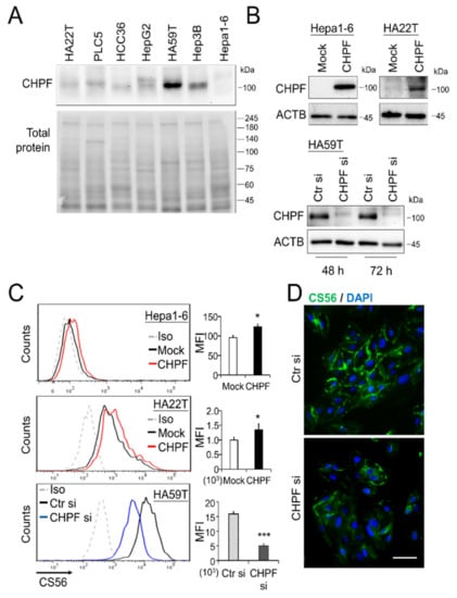 CHPF expression in HCC cells. (A) CHPF expression in seven HCC cell lines. Protein expression was analyzed by Western blotting, and total protein was used as an internal loading control. (B) Stable CHPF overexpression in Hepa1-6 and HA22T cells. Transient CHPF knockdown in HA59T cells 48 and 72 h after siRNA transfection. Protein expression was analyzed by Western blotting, and β-actin (ACTB) was used as an internal control. (C) Surface CS56 antibody staining (an anti-chondroitin sulfate antibody) on Hepa1-6, HA22T, and HA59T transfectants was analyzed by flow cytometry with anti-mouse IgM-FITC. Nonspecific mouse IgM was used as an isotype control (Iso). * p < 0.05, *** p < 0.001. (D) Fluorescence microscopy analysis of CS56 (green); DAPI (blue) indicated the position of the nucleus. The scale bar indicates 50 μm. The cells were fixed with paraformaldehyde without permeabilization.