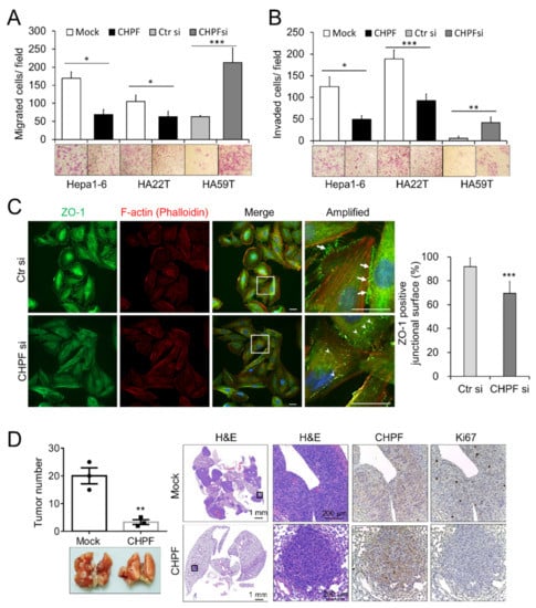 Influence of CHPF on the migration, invasion, and metastasis of HCC cells. (A) CHPF regulated transwell cell migration and (B) Matrigel invasion. CHPF overexpression significantly suppressed the migration and invasion abilities of Hepa1-6 and HA22T cells, and CHPF knockdown increased the migration and invasion abilities of HA59T cells. The data presented as the means from three independent experiments ± standard deviations. Representative images are shown at the bottom; * p < 0.05; ** p < 0.01; *** p < 0.001. (C) Immunostaining of ZO-1 (green) and F-actin (red) in HA59T cells. Amplified images are shown on the right. Note that ZO-1 is expressed on the plasma membrane of two neighboring control cells (indicated by arrows); CHPF knockdown increased the intracellular distribution of ZO-1 (indicated by arrowheads). The scale bar indicates 20 μm. The percentage of plasma membrane-associated ZO-1 positive cells was shown at right. *** p < 0.001. (D) CHPF suppressed lung metastasis. The number of tumors was decreased in the CHPF-overexpressing group. Representative images are shown at the bottom. Representative images of the hematoxylin and eosin staining and immunohistochemical staining for CHPF and Ki67 in the lung sections are shown on the right; ** p < 0.01.