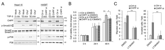 TGF-β signaling modulates CHPF-mediated malignant phenotypes. (A) Hepa1-6 and HA59T transfectants were starved for 3 h and then treated with (+) or without (−) TGF-β (20 ng/mL) for 15 and 30 min. Cell lysates (20 μg) were analyzed by Western blotting with various antibodies, as indicated. (B) Effects of LY364947, a TGF-β inhibitor, on CHPF-mediated cell viability. HA59T transfectants were treated with a solvent (0.02% DMSO) or LY364947 (0.5 μM) and then analyzed by CCK8 assay. * p < 0.05, ** p < 0.01. (C) Effects of LY364947 on CHPF-mediated migration (left) and invasion (right). HA59T transfectants were treated with a solvent (0.1% DMSO) or LY364947 (2.5 μM) and then analyzed by transwell migration and invasion assays. The data are shown as the means ± standard deviations. ** p < 0.01.