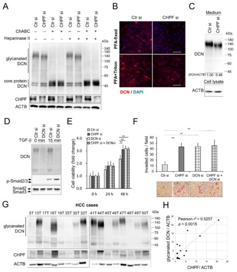 CS synthases-remodeled CS proteoglycans (CSPGs) are crucial for modulating signal transduction and cell–cell communication [,,], and CSPG DCN is known to be a key regulator of TGF-β signaling [,,]. Thus, we examined the influence of CHPF on DCN in HCC cells. Western blotting revealed that CHPF knockdown decreased the molecular weight of glycosaminoglycan-containing (glycanated) DCN in HA59T cells (Figure 6A), whereas CHPF overexpression increased the levels of glycanated DCN in HA22T cells (Figure S3A). Moreover, glycanated DCN diminished to the size of DCN core protein only when the GAG chains were removed by chondroitinase ABC, indicating that CHPF knockdown shortens the CS chains on DCN. To examine the effects of CHPF on DCN distribution, we performed immunostaining of DCN on HCC cells with or without cellular permeabilization, which showed that CHPF knockdown substantially decreased the distribution of extracellular DCN surrounding cells, whereas intracellular DCN was not significantly affected (Figure 6B). In contrast, CHPF overexpression increased extracellular DCN distribution on HA22T cells (Figure S3B). Consistently, the protein levels of secreted DCN were decreased in CHPF knockdown medium (Figure 6C); whereas they increased in CHPF overexpressed conditional medium (Figure S3C). We suggested that CHPF-modified DCN may enhance its stability surrounding HCC cells. To further examine the contribution of DCN in TGF-β signaling and CHPF-regulated phenotypical changes, we silenced DCN expression by siRNA. The silencing of DCN enhanced TGF-β signaling in HCC cells (Figure 6D). Additionally, silencing of DCN increased cell viability and cell invasion in control cells, but did not have further influences on CHPF knockdown cells (Figure 6E,F). We subsequently evaluated the correlation between CHPF expression and DCN in HCC tissues. Western blotting indicated that CHPF expression was positively correlated with the expression of glycanated DCN (Figure 6G,H), suggesting that CHPF-modified DCN may increase glycanated DCN accumulation in HCC tissues.