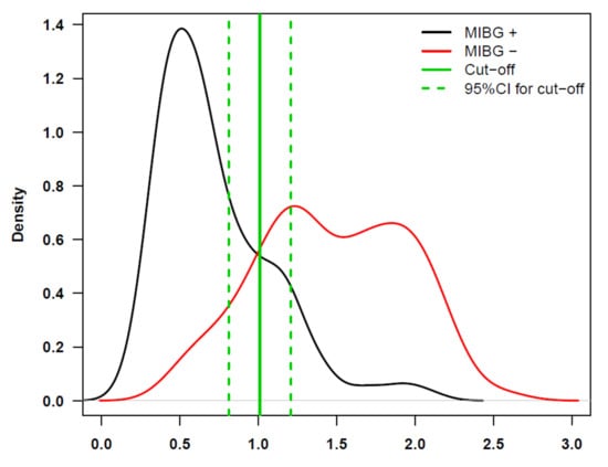 In order to estimate an optimal cutoff for ADC, that best discriminates positive versus negative MIBG findings, we used the Youden index maximization method [22]. We analyzed the data values of 348 MRI+ observations from 44 HR-NB patients studied by MRI and MIBG. Bootstrap was used to determine the confidence intervals (CI) [23]. The cutoff obtained was 1.01, 95% CI = (0.81, 1.21). The density plot with the cutoff and CI is shown in Figure 1.