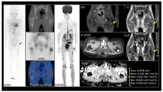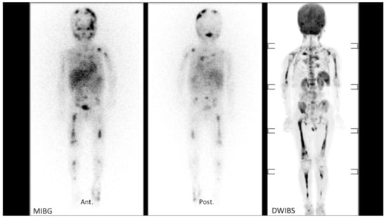 - Colombo, M.C.; Clemente, E.J.I.; Munuera, J.; Castañeda, A.; Mora, J.; Barber, I. Re-staging stage IV neuroblastoma after conventional chemotherapy. Comparison of MIBG and Whole Body MRI DWI images in the evaluation of bone involvement. EPOS ECR 2020, C-14881. [Google Scholar] [CrossRef]