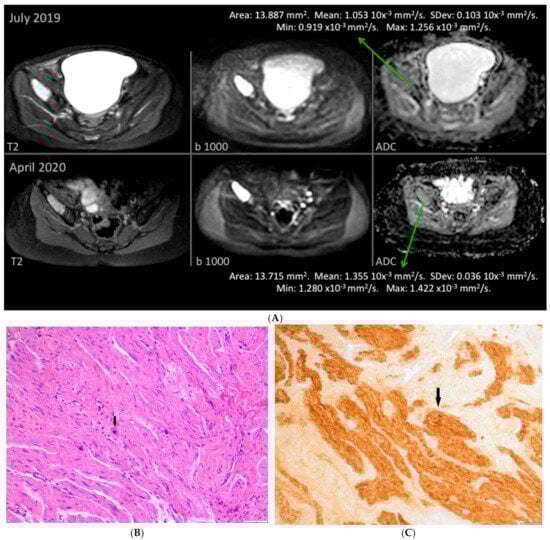Correlation of functional imaging for patient #1 (Table 1) and histopathology. (A) Correlation between pre-immunotherapy treatment (top panels) functional imaging of chemo refractory iliac bone lesion and post immunotherapy evaluation (bottom panels: STIR T2 hyperintense focal iliac bone lesion with restricted diffusion -b 1000- and high- > 1.01- ADC values) of the same iliac lesion. (B) Bone tumor from patient #1 post immunotherapy. This sample shows ganglioneuromatous tissue with Schwannian stroma and some mature ganglion cells (arrow). This sample corresponds to the iliac bone lesion described by functional imaging in (A) (bottom panels). (C) S100 immunostaining highlighting the Schwannian stroma (arrow) of the same iliac bone tumor.