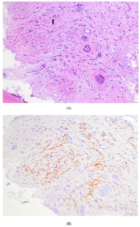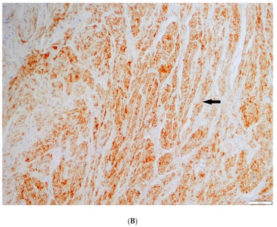 Describes case #4 (Table 1 and Table 2), a patient managed initially with naxitamab and GM-CSF with no objective response (MIBG and PET-FDG diffusely positive in multiple bone lesions). Subsequently patient received HITS showing an objective response (lower Curie score) and PET-FDG turning negative. (A) Bone tissue diffusely infiltrated by tumor composed of Schwannian stroma (arrow), (B) S-100 immunostaining depicting massive Schwannian stroma (arrow).